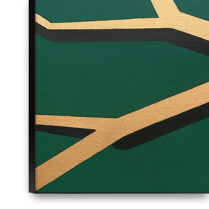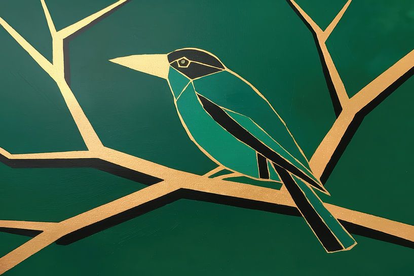 A geometric bird sits on angular, gold-coloured branches against a deep green background. Clean polygonal surfaces and sharp lines give the animal a modern, graphic look. The shiny gold contrasts elegantly with the rich green, making both the shape and silhouette stand out clearly. The composition is calm and balanced, with a clear…