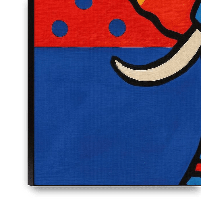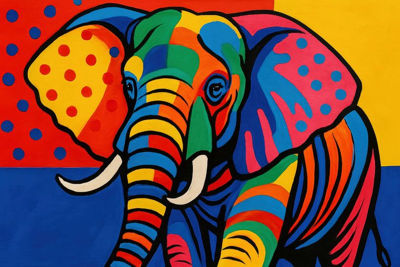 An expressive pop-art-style elephant fills the image with large areas of colour, contrasting dots and rhythmic stripes. Thick contour lines give strength to the slender trunk and rounded forms of the ear. The palette switches between warm and cool tones, creating vivid depth and dynamism. The tessellation is tightly geometric, with…