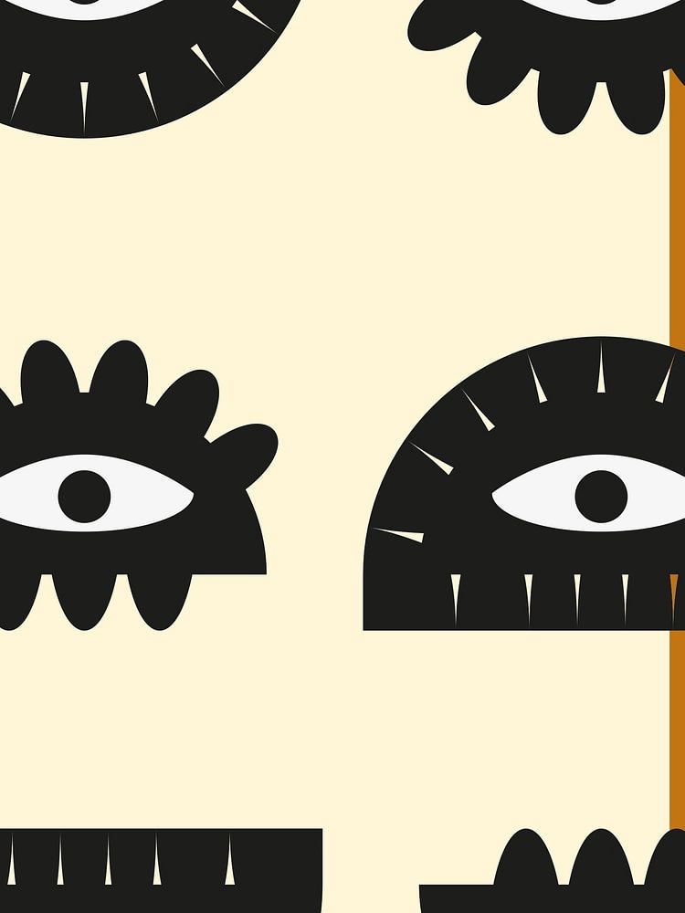 It is a minimalist work of black/white eyes on a brown/beige background.