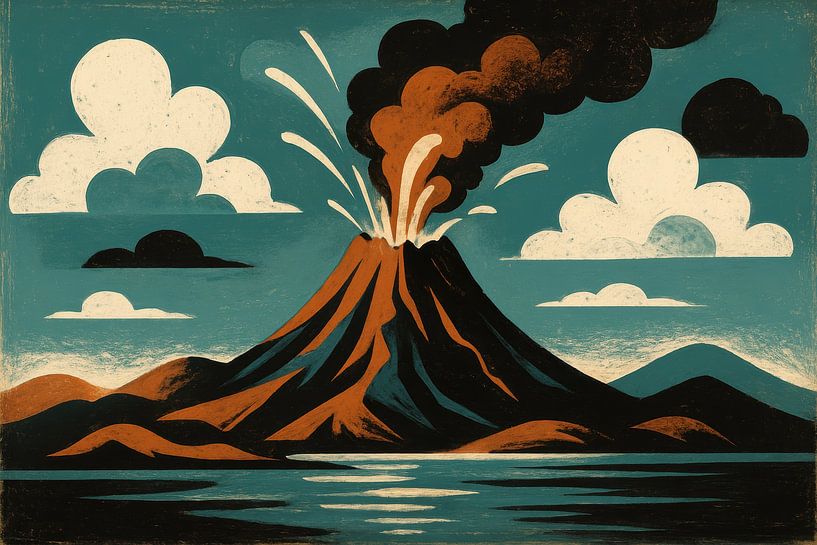 A stylised volcano erupts with a broad plume of smoke, while bright splashes fan out above the cone. In the foreground, a calm water surface reflects the mountain form, with gently rounded clouds framing the rough relief. The image uses taut planes and sharp lines, contrasting the dynamism of the eruption with the serene horizon. Earth…