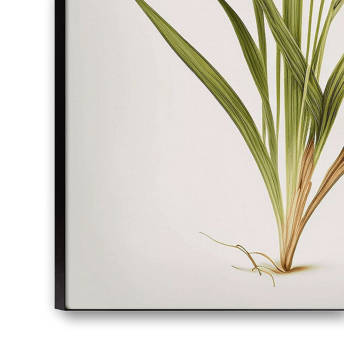 The fine strands of roots at the base hint at the plant's resilience and disappear discreetly into the background, adding to the simplicity and elegance of the composition. The minimalist, almost scientific depiction makes this picture both a work of art and an instructive botanical study. The choice of a soft, neutral background enhances the visual impact of the grass and allows every detail to stand out clearly.
