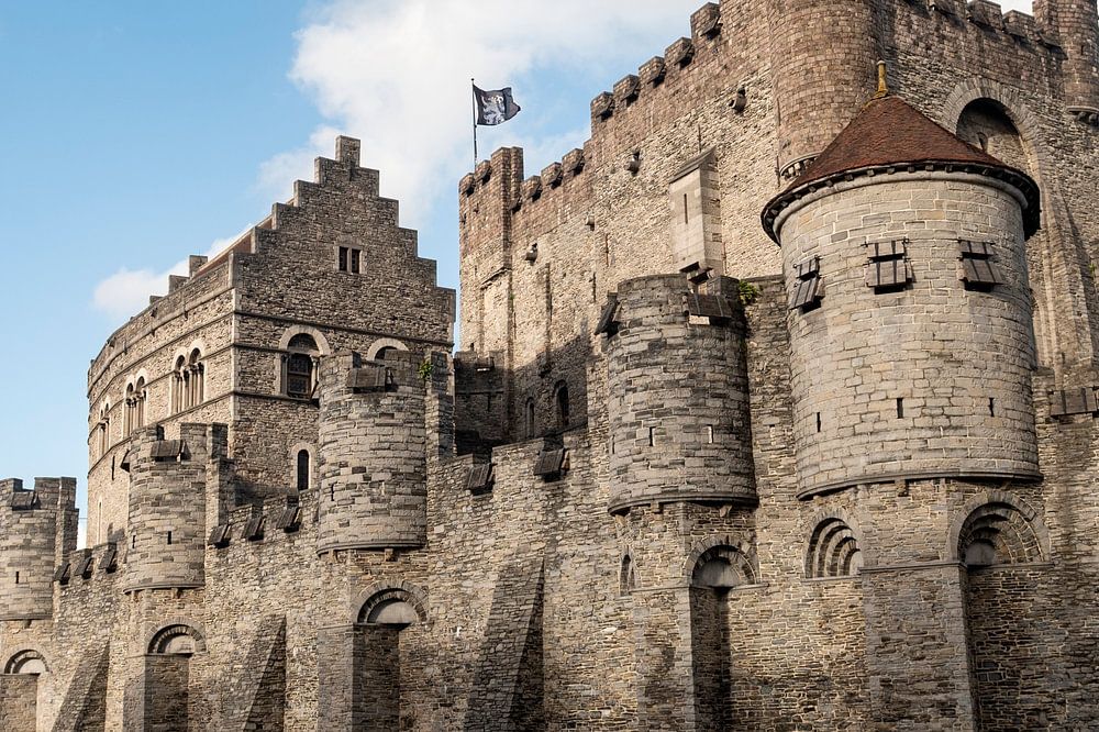Gravensteen castle and example of a motte-and-bailey castle. castle, river, moat, Lieve, River,