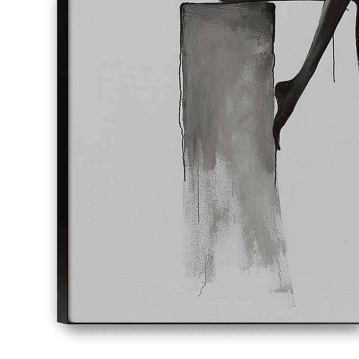 Gravity Pause - This abstract painting shows a stylised, graceful figure of a woman in shades of black and white, sitting on a grey, rectangular block, with her head and arms resting in a bending position.