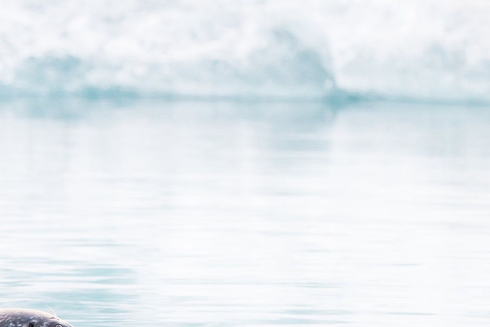 A gray seal swimming in the Jökulsárlón glacial lake in southern Iceland. The lake is full of huge ice floes through which the animal maneuvers in search of food. The seal can enter this lake because there is an open connection to the sea. By adopting a low vantage point, I got to eye level with the seal and the large chunk of ice is clearly visible in the background.