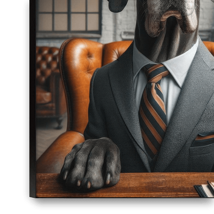 This is a digital image of a Great Dane (dog) wearing a tailored suit. The dog sits in an office setting and looks straight into the lens.