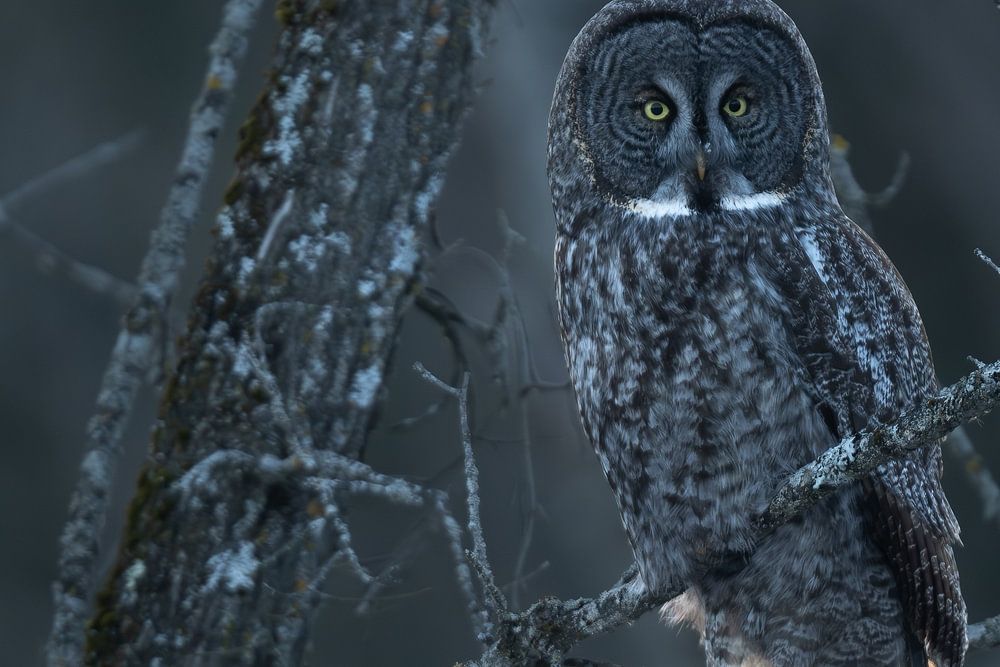 Great grey owl in the forest, a hard-to-find owl species. photographed in Canada during sunrise. Lightroom noise reduction applied.