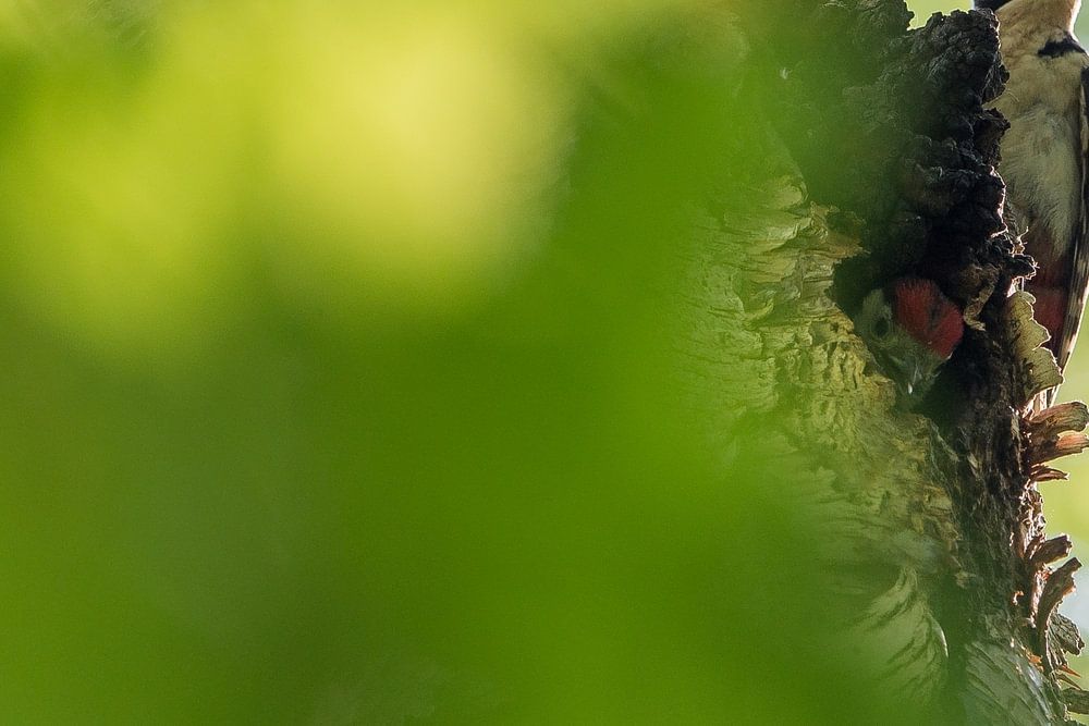 A great spotted woodpecker is a common species commonly found in wooded areas. They are also regularly seen in gardens. This specimen was sitting on the trunk of a birch tree. In the foreground and background you can see the fresh spring leaves.