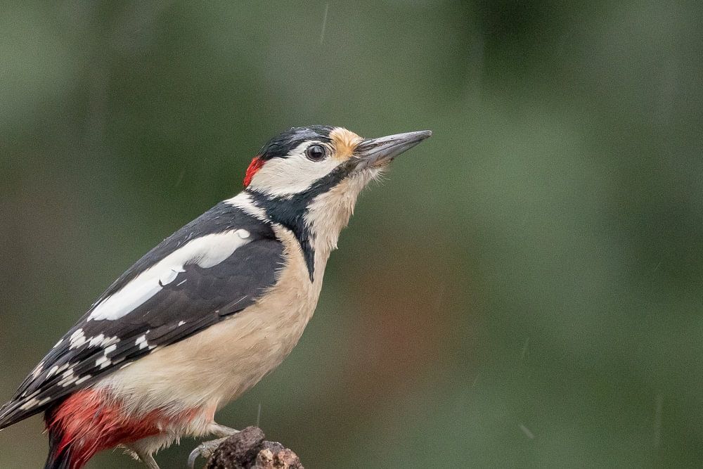 Great spotted woodpecker in a rainstorm in Delden, Overijssel