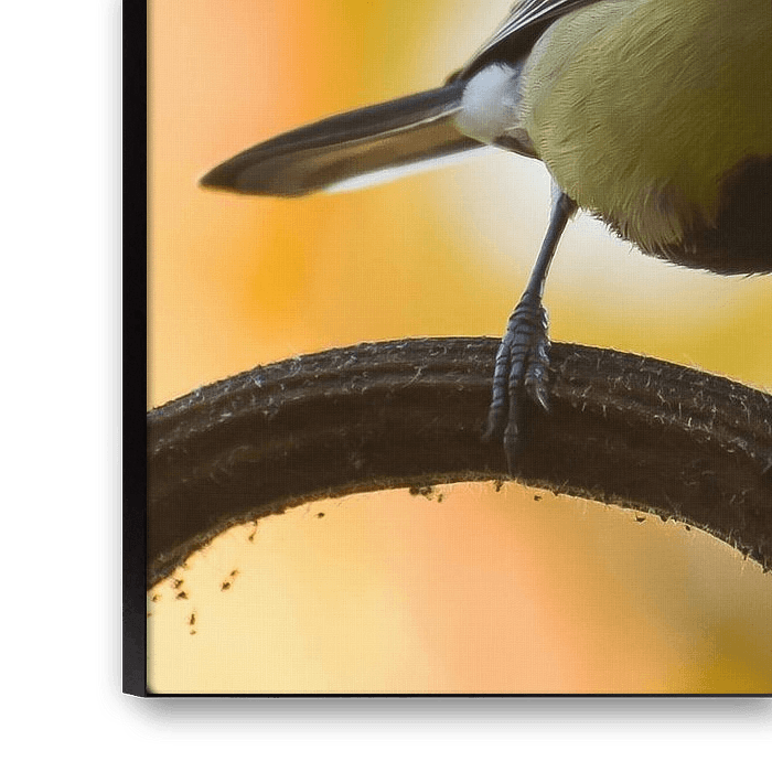 Great tit on a sunflower stem. In autumn, they eat the seeds from the sunflower. In the background is and oak tree in full autumn colours. This makes for a beautiful background.