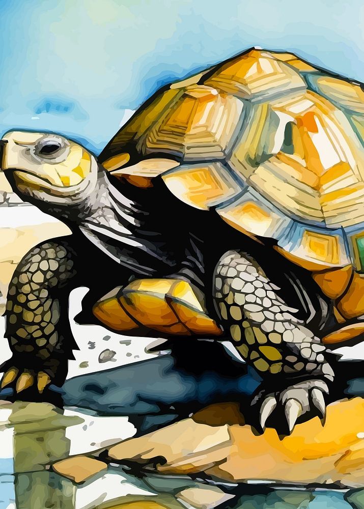 A Greek tortoise in watercolor showcases its distinct, patterned shell in shades of earthy browns, yellows, and greens, with soft, detailed brushstrokes that emphasize its textured surface. The tortoise's gentle expression and slow movement are captured in a calm, serene pose, often set against a light, natural background that enhances its quiet beauty. The use of delicate washes and fine details brings the tortoise's unique markings and slow-paced grace to life, creating a peaceful, harmonious portrayal.