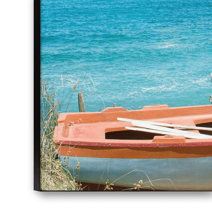 Beautiful Greek bay with a red and white boat in the foreground and blue water in the background