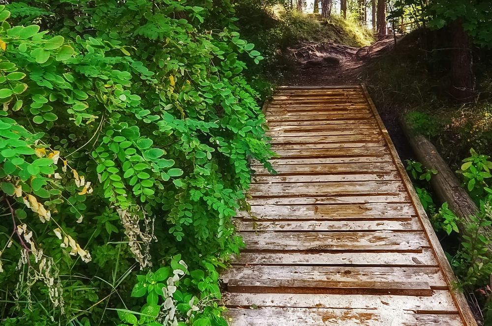 In a wild and original landscape, this wooden path leads into the forest. Surrounded by rampant wild plants, it blends in with nature. At the other end you can see a small clearing in the forest. A feeling of adventure, discovery, freedom and endless nature.... wild and beautiful!