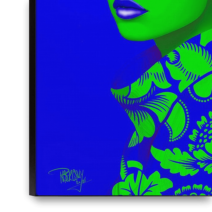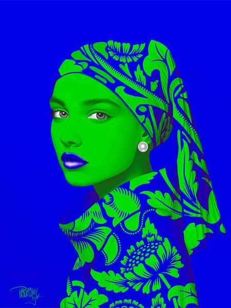 This digital artwork by artist René van den Berg is a bold, contemporary interpretation of the Girl with a Pearl Earring. The classic profile and recognisable pearl earring still form the anchor point, but have been transformed into a daring, almost graphic visual language. The face is rendered in intense green, which contrasts sharply…