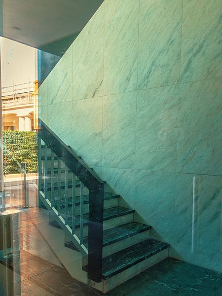 This impressive photograph shows the vibrancy of Zurich. By reflecting the surroundings in the glass of the entrance area, a stairwell and staircase are placed in a new context. The composition conveys a sense of urban serenity and is perfect for relaxing in a modern living or working space. This depiction of the city combines…