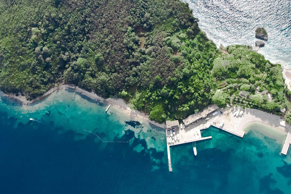 Green forested island in summer from above. landscape below (aerial photo from a paraglider) with the coast and the blue sea, Montenegro, Budva.