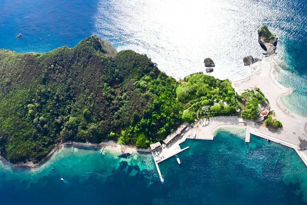 Green forested island in summer from above. landscape below (aerial photo from a paraglider) with the coast and the blue sea, Montenegro, Budva.