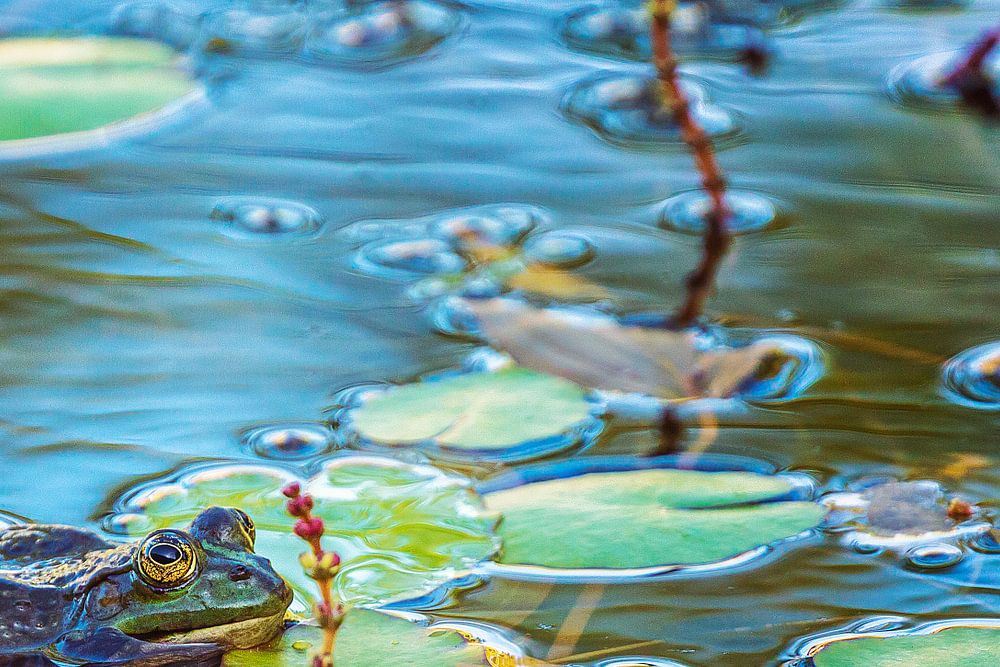 Green frog (Pelophylax) between water plants in a pond by Carola Schellekens