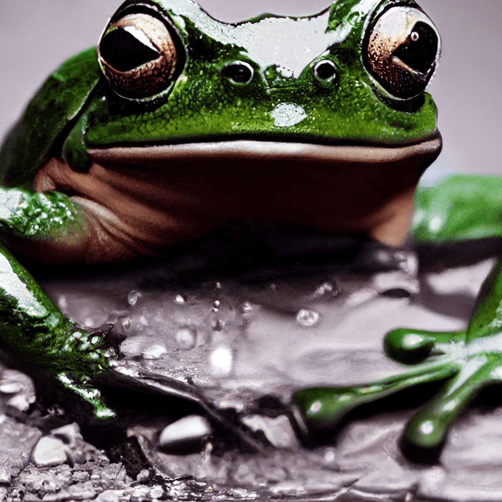 A bright green frog with large, golden eyes sits on a grey, stony background, surrounded by clear water and falling drops. The frog's skin is shiny and moist, and its characteristic large eyes give it an attentive expression. The water is calm, with gentle ripples and slightly reflects the surroundings. The falling drops create small ripples on the surface of the water. The background is in soft grey tones, which draws the focus to the frog and the drops of water. The scene captures a tranquil moment in the frog's natural environment.