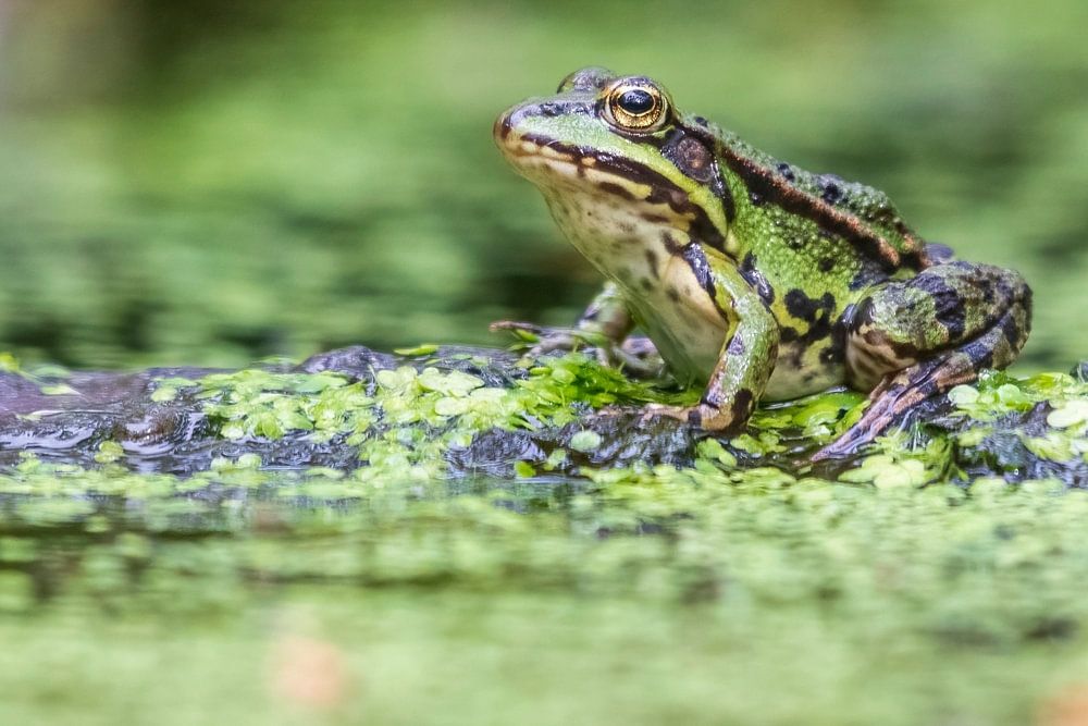 The green frog is an amphibian that is mainly is ponds and ditches. You can hear its croaking very well when you live next to it. They mainly eat insects that they catch right out of the air with their tongues.