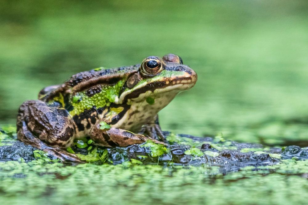 The green frog is an amphibian that is mainly is ponds and ditches. You can hear its croaking very well when you live next to it. They mainly eat insects that they catch right out of the air with their tongues.
