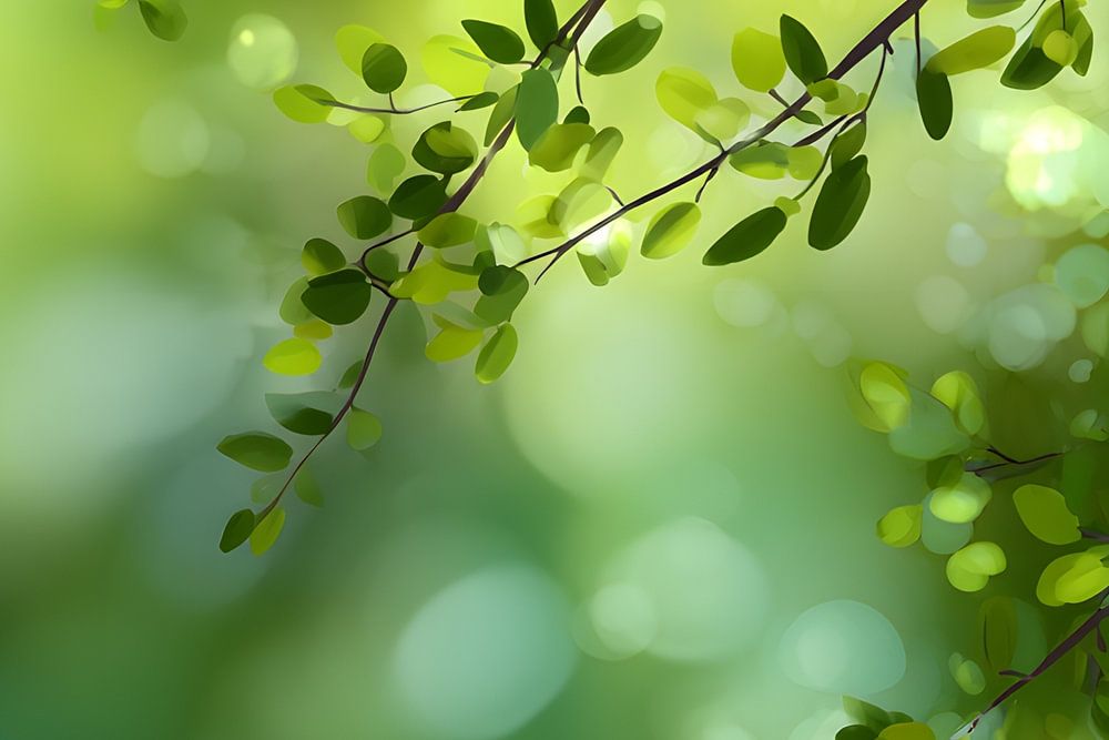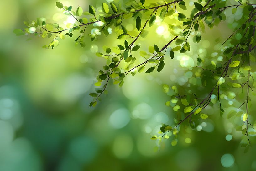 Delicate green twigs with small leaves stretch out against a softly blurred background of light and bokeh. Sunbeams filter through the foliage, creating a lively interplay of light and shadow. The composition is light and open, with no fixed focal point. The mood feels calm, fresh and rejuvenating – like a moment of pause in spring,…