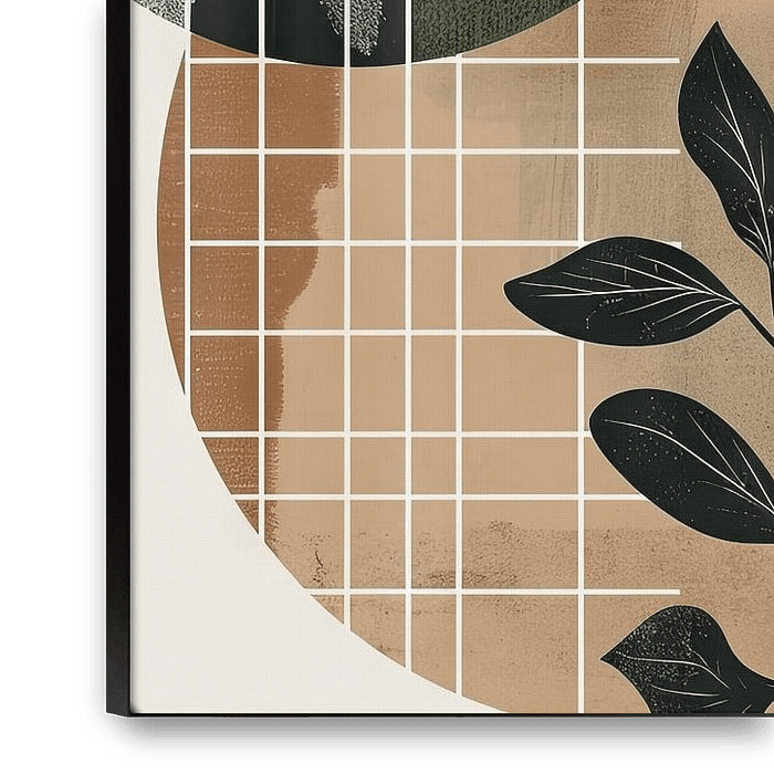 This composition combines the vibrancy of green leaves with geometric shapes and lines. The soft beige and brown tones in the background create a calming atmosphere, while the fine black contours and circles give the work a modern elegance. Perfect for nature lovers who want to add a touch of contemporary art to their home. This piece…