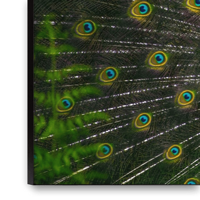 This photograph captures a proud peacock straight from the front, with the greener tones of its plumage given added emphasis. The frontal perspective and fully extended tail unite to create a symmetrical, almost graphic composition that underlines the bird's strength and elegance. The deep emerald green, combined with subtle shades of…