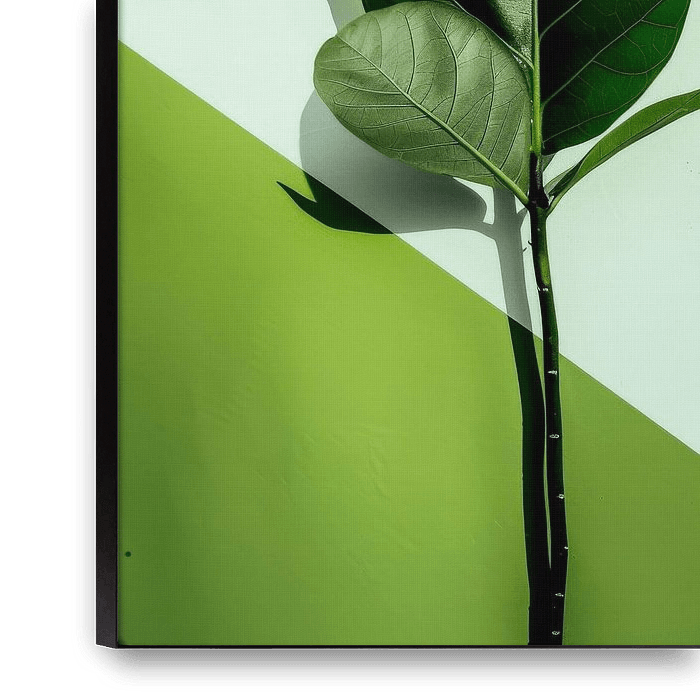 A lively symbiosis of form and colour unfolds here. The glossy, lush leaves stand out dynamically against the soft, two-tone background. The harmonious combination of green and white tones conveys a sense of calm and natural freshness, while the elegantly curved silhouette of the leaf enlivens the composition in an organic way.