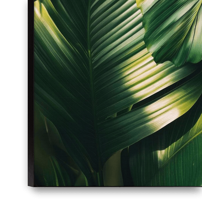 A lush sea of leaves unfolds, where lush green tones float around in harmonious shades. The large, curved leaves stretch out towards the light and cast soft shadows that bring the textured surface to life. This fascinating interplay of nature conveys a feeling of freshness and tranquillity, as if you were immersed in a tropical oasis.