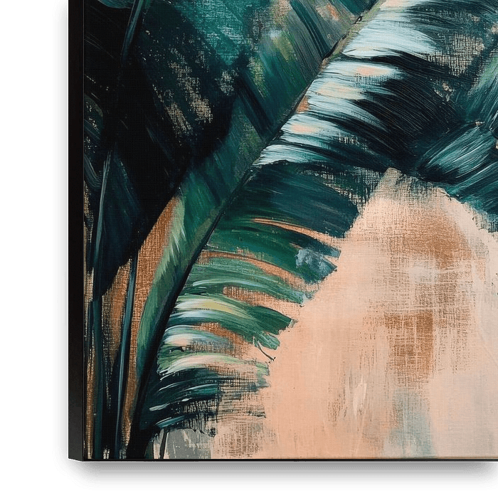 Lush leaves unfurl in soft shades of green, swaying in the breeze like elegant dancers. Their vibrant texture and dynamic arrangement lend this work of art a refreshing liveliness, while the warm beige background radiates a harmonious calm. A harmonious interplay of nature and style that revitalises the senses.