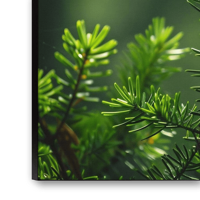 This serene design captures the beauty of nature in a close-up of conifers bathed in soft sunlight. The green tones combined with the subtle light create a soothing and inviting atmosphere, perfect for a room where you want to unwind. Realistic and minimalist in nature, this image can add a touch of natural splendour to both modern and classic interiors. A perfect choice for anyone who wants to experience the calming power of nature in their home.