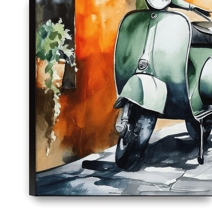 Buy this painting Green scooter on cobblestones - watercolour by Niklas Maximilian as a reproduction on canvas, ArtFrame, poster and wallpaper, printed on demand in high quality.