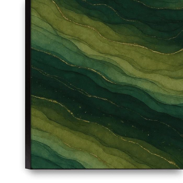 An elegant, organic motif of layered green tones, interspersed with delicate golden lines. The flowing shapes are reminiscent of geological structures or topographical maps, creating a calm, luxurious atmosphere. Perfect for modern living spaces, offices or minimalist interiors that seek to combine naturalness and elegance.