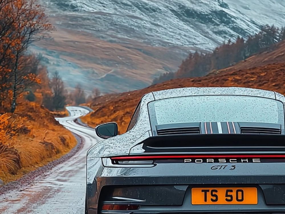 A tough grey Porsche 911 GT3 cuts through the winding roads of the Scottish Highlands. Misty hills and rugged mountains surround the sports car as the sun breaks through the clouds. The wet tarmac reflects its sleek silhouette, and the rear spoiler betrays its brute strength. Pure speed in a breathtaking landscape.