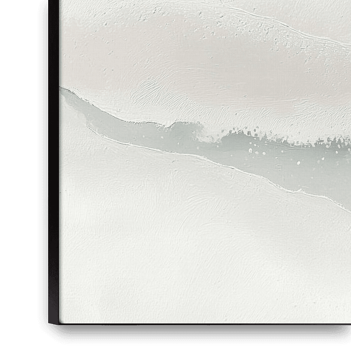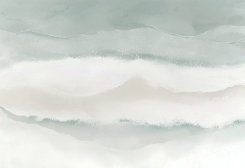 Serene abstraction of soft areas of colour flowing horizontally across the canvas. The dominant hue is a soft grey-green (colour), interspersed with layers of white and light beige, making the whole reminiscent of a tranquil sea or a misty dune landscape. The flowing lines suggest movement, but at the same time there is a deep calm in…