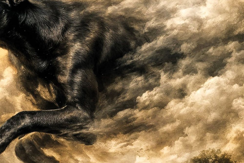 This image focuses on the greyhound: a breed known for its speed, elegance and extreme sensitivity. Here, it appears not as a dog running on a track, but as a creature emerging from a storm of clouds, wind and light. Its body seems to be partly formed from the air itself, as if it were created at the intersection of power and…