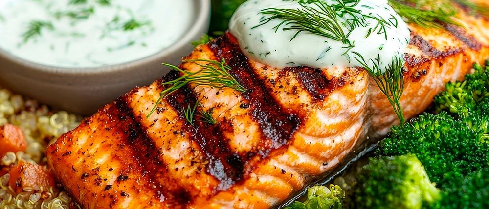 An artfully arranged dish unfolds its colourful splendour in an elegant bowl - juicy salmon surrounded by crunchy vegetables and aromatic quinoa. The yoghurt sauce sets fresh accents and the wooden base adds warmth. Perfect for the kitchen, where cooking and enjoyment are celebrated!