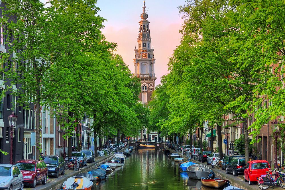 Prachtige opname van de Groenburgwal in Amsterdam tijdens zonsondergang in de lente met groene bomen en op de achtergrond de zuiderkerk
