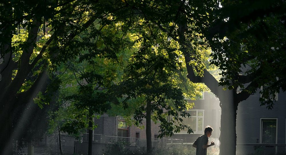 Runner in the Noorderplantsoen, Groningen. The morning sun casts a labyrinth of light and shadow over the park, where a runner makes his way through the peaceful setting. The trees of the Noorderplantsoen, a historic park that weaves through Groningen's urban fabric like a green thread, stand as silent witnesses as the runner finds his rhythm on the soft carpet of fallen leaves.