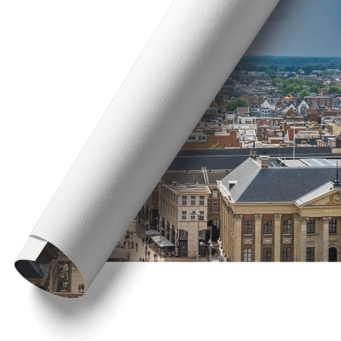 Panoramic view over the city of Groningen in The Netherlands from the Forum cultural center with a dramatic sky above during a stormy springtime day. The Town hall at the Grote Markt and Martini Tower are visible in the foreground.
