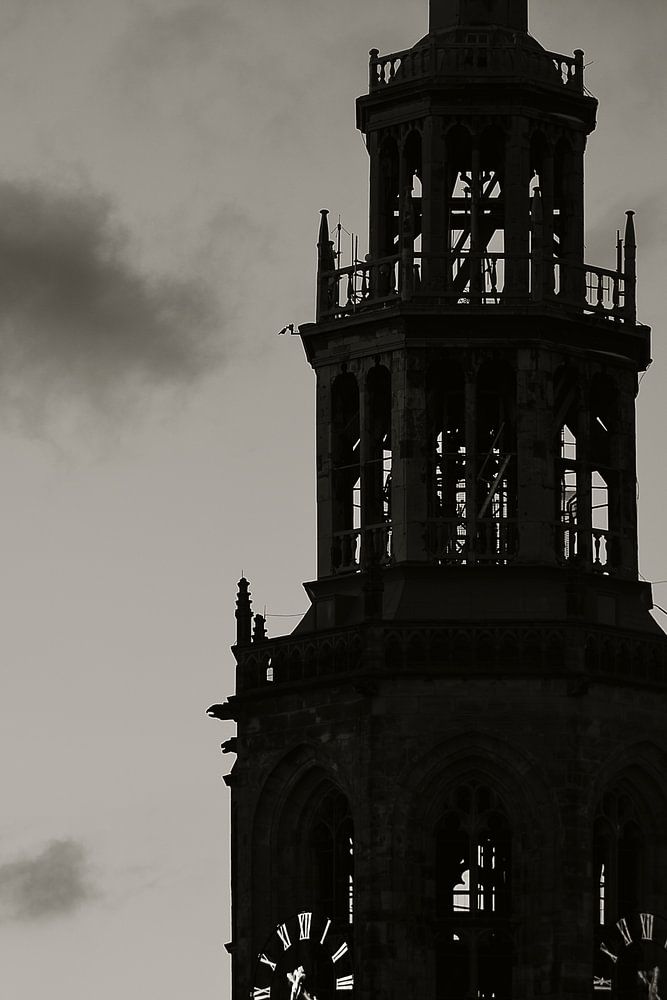 Groningen: Time for new light - The Martini Tower, proud and timeless, rises against a dramatic sky in this atmospheric shot. The bells on either side of the tower mark the passage of time, while the soft light radiates a sense of hope and new beginnings. This photograph symbolises the transition from darkness to light, from past to future.