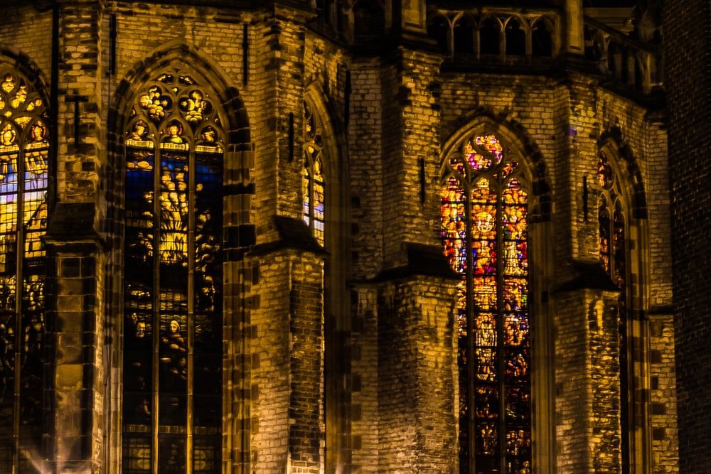 Grote Kerk Dordrecht from the Grotekerksbuurt with light stripes from a car.
