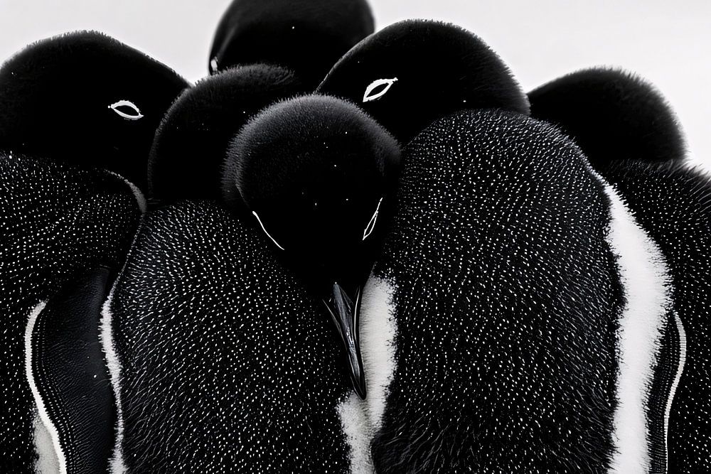 This beautiful photo shows a group of penguins close together in a winter landscape. The birds are standing in the snow and their black and white feathers stand out beautifully against the light background. The image exudes a sense of togetherness and warmth, perfect for those who love nature and wildlife. This design adds a rustic and natural feel to any room, whether it is a bedroom, office or living room. The monochrome style gives it a timeless look that suits modern and minimalist interiors. A perfect choice for animal lovers and fans of natural artwork!