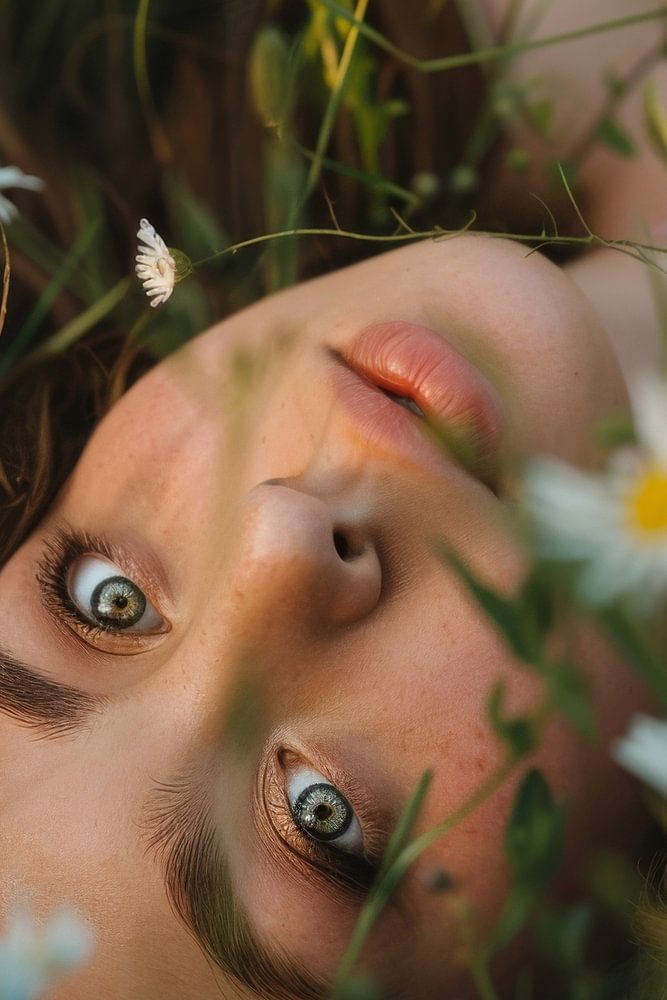 In the middle of a gentle meadow lies a girl whose eyes glow a mesmerising blue. Surrounded by colourful flowers and green stalks, her face radiates calm and vulnerability. The delicate details of her features harmonise with the natural surroundings, creating a poetic connection between man and nature.