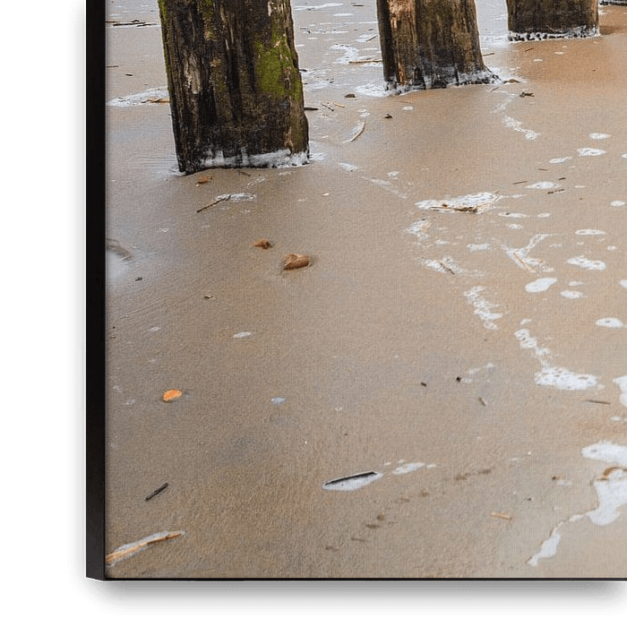 Zoutelande, seaside resort on the Walcherse coast. Pileheads on the beach with descending water. Shot was taken with a long shutter speed which results in the soft appearance of the water.