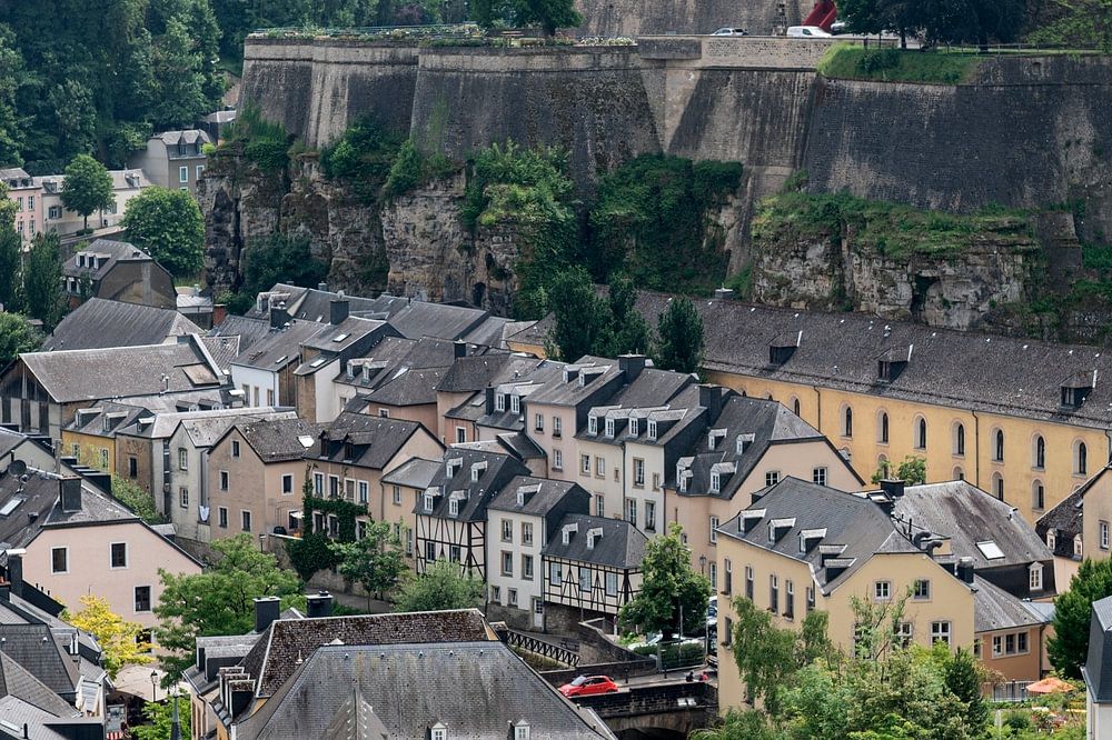 Luxembourg View across the slate tiled rooftops of Grund and the Alzette River Valley. roofs, roof,