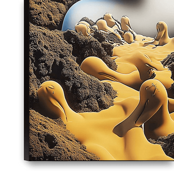 In a surreal realm where reality bends, a colossal guard dog watches over a river of molten, liquid-like ducks that spring from the earth itself. The stark contrast between the watchful, divine-looking figure and the river of liquid gold creates an eerie yet mesmerising balance between power and transformation.