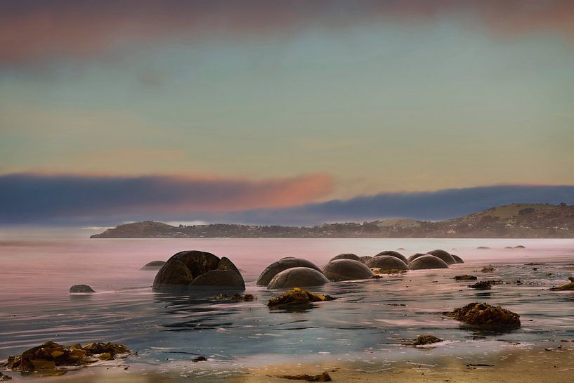 When the tide is low and the light is soft, these ancient stones emerge as sentinels of the coast. Silent, round and immovable, they lie at sunrise on the beach near Moeraki, New Zealand.