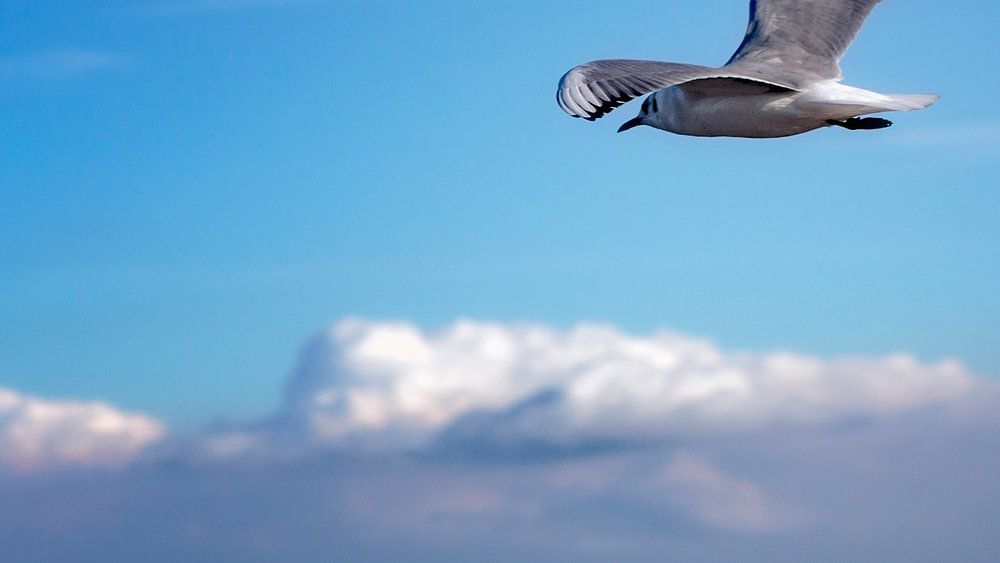 A seagull in Volendam flies towards the harbour and the water. Part of the harbour mouth can still be seen in the background. It is the late summer of 2022. The sun is shining, the sky is blue, it is almost windless, but the signs of autumn are appearing on the horizon.