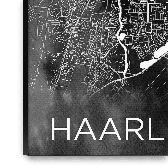 This is a very accurate city map of Haarlem with a modern black and white background painted with black watercolour on watercolour paper with the wet-on-wet technique. Because the watercolor is applied in a rather abstract way, you see in this work a plane division that consists of…